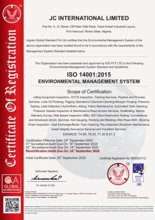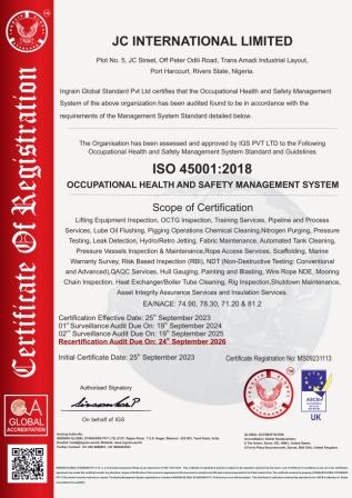Julinat Technical Services Ltd whose scope of business covers “”Facilities Maintenance and Support (Valve Repairs and Calibrations, Belt Alignment and Tensioning Services, Instrumentation & Control Services, Lifting Inspection Services, Hose Management, Tank Cleaning and Calibration), Material Services (Material Procurement & Supply Chain Management); and Heat Exchanger Services.” is certified to EMS (ISO 14001:2015) & OHSMS (ISO 45001:2018) standards by IGS after obtaining their QMS Certification 2 years earlier. Congratulations as you work towards the sustainability of this integrated management system (IMS).
