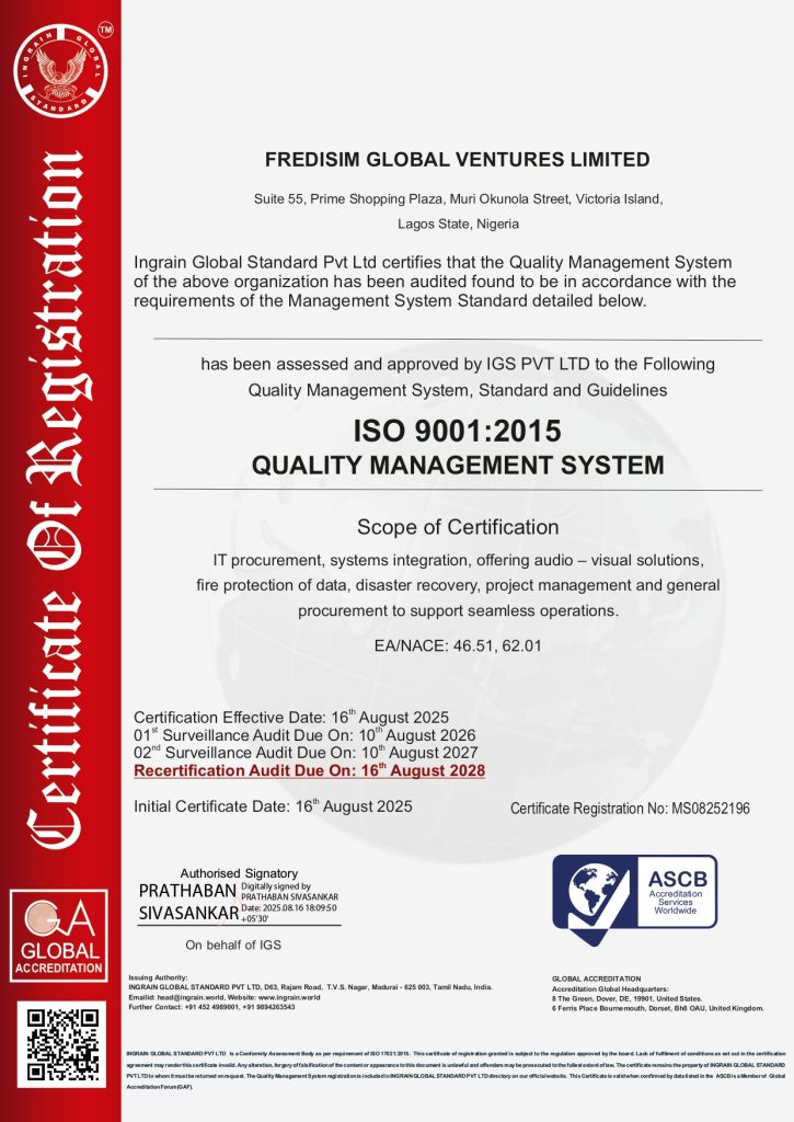 Fredisim Global Ventures Ltd whose scope of business is “IT procurement, systems integration, offering audio-visual solutions, fire protection of Data, disaster recovery, project management, and general procurement to support seamless operations” has achieved their QMS (ISO 9001:2015) Certification through IGS. Congratulations for this achievement!!!