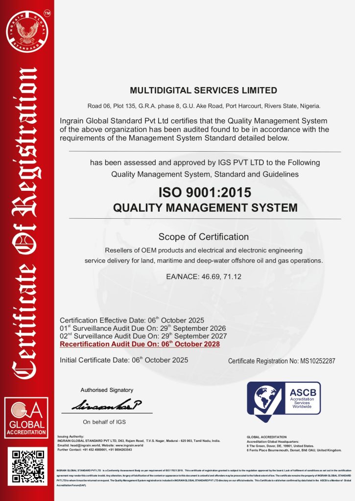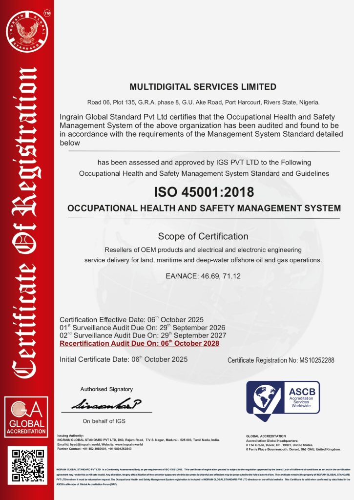 Multidigital Services Ltd whose scope of operation is “RESELLERS OF OEM PRODUCTS AND ELECTRICAL AND ELECTRONIC ENGINEERING SERVICE DELIVERY FOR LAND, MARITIME AND DEEP-WATER OFFSHORE OIL AND GAS OPERATIONS” have been certified to QMS (ISO 9001:2015) & OHSMS (ISO 45001:2018) standards by IGS. A great milestone achievement. Congratulations!!!